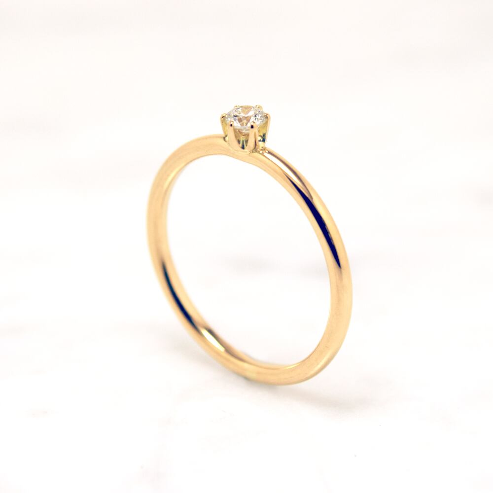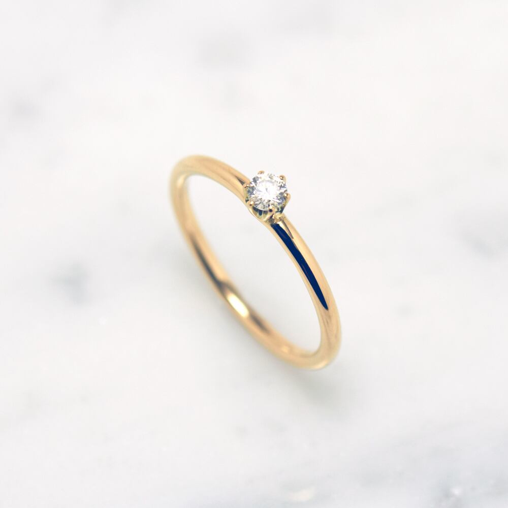 「Pure Diamond Ring」は、シンプルなK18ゴールドの細身リングに、0.1ctのダイヤモンドをあしらった1点もののジュエリーです。