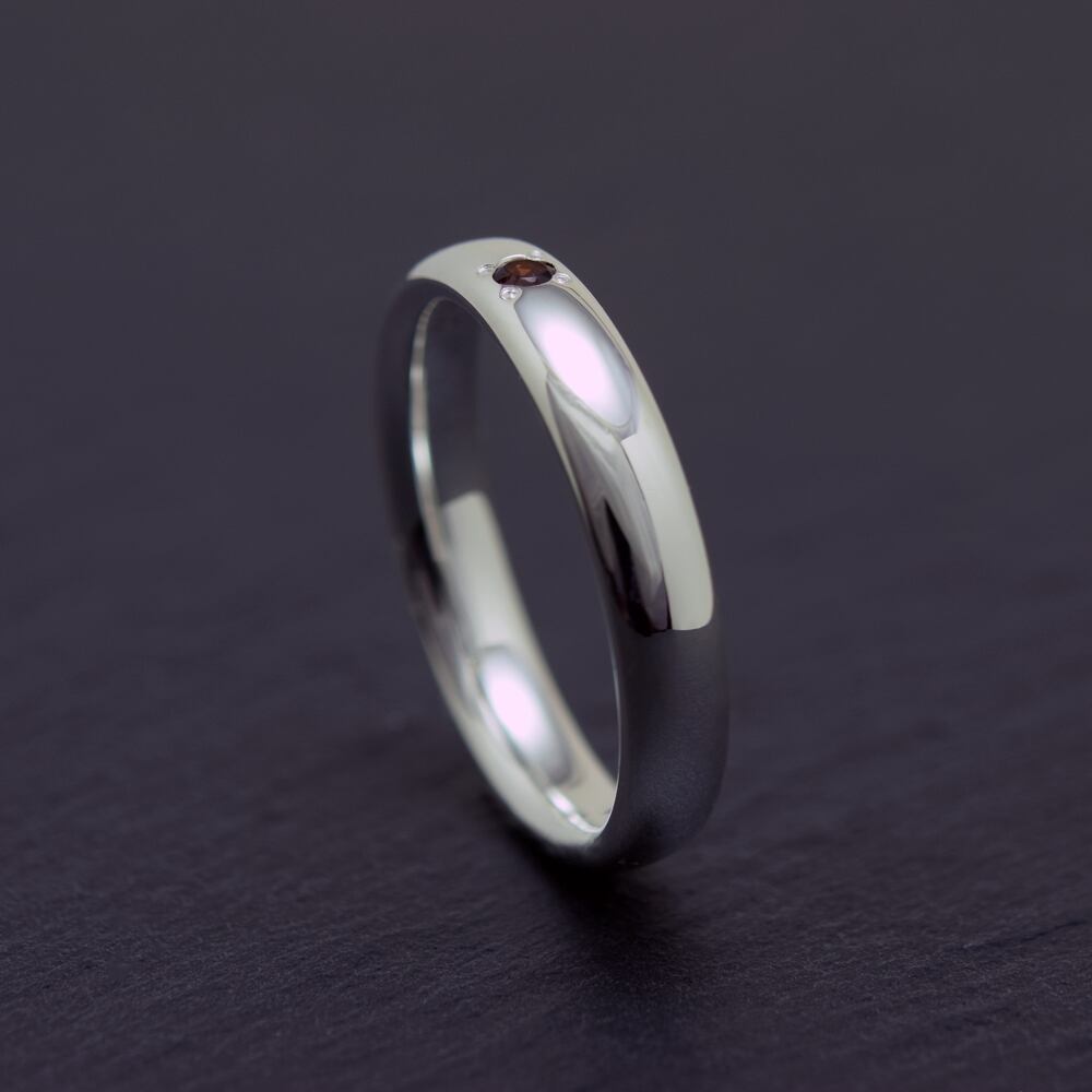 シルバーの鏡面仕上げとガーネットの深紅が、シンプルな中に上品なアクセントを添えています。